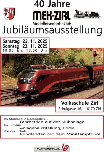 Jubiläumsfahrtage des Modelleisenbahnklubs am Samstag, 22.11. und Sonntag, 23.11.25 jeweils von 10 bis 17 Uhr im Dachboden & dem Turnsaal der Volksschule, Schulgasse 16, 6170 Zirl.
