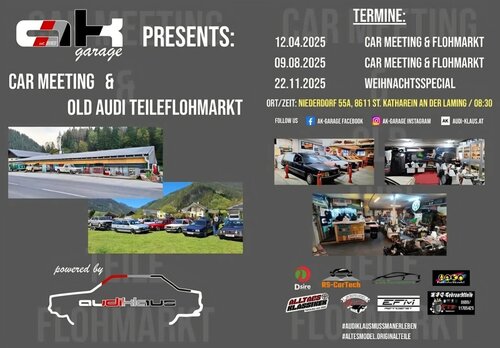 Weihnachtsspecial Car Meeting & Old Audi Teilemarkt mit Tombola beim Audi-Klaus am Samstag, 22.11.25 ab 8 Uhr in Niederdorf 55a, 8611 St. Katharein an der Laming (bei Bruck an der Mur).