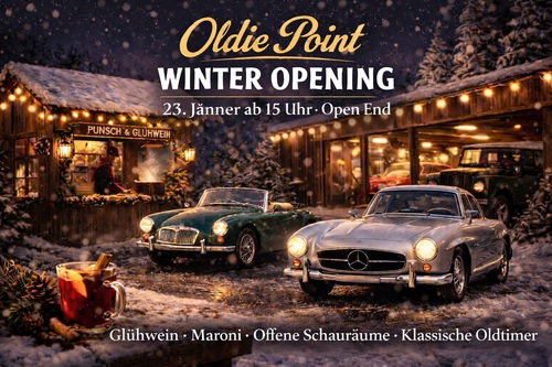 Klassiker treffen Glühwein beim „Winter Opening“ bei Oldie-Point in 2460 Bruck an der Leitha, Feldgasse 75, am Freitag, 23.1.26 ab 15 Uhr. Zu besichtigen sind drei Hallen voller Oldtimer und ein liebevoll gestaltetes Landwirtschaftsmuseum. Es gibt Glühwein, Punsch & frisch gebratene Maroni.