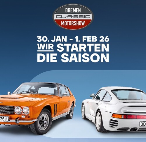 Die Classic-Motorshow am Messegelände in 28215 Bremen, Findorffstraße 101, von Freitag, 30.1. bis Sonntag, 1.2.26 markiert seit über 20 Jahren den Saisonstart für klassische Autos und Motorräder in Deutschland. Über 700 Aussteller und 100 Clubs erwarten 46.000 Besucher in acht Hallen auf über 52.000 m². Das Besondere ist hier der Teilemarkt, aus der sich die Messe entwickelt hat. Geöffnet täglich 9-18 Uhr, Tageseintritt 18 €.