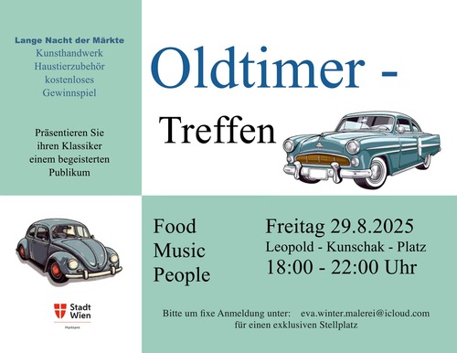 Bei der „Langen Nacht der Wiener Märkte“ haben am Freitag, 29.8.25 viele Marktstände bis 23 Uhr geöffnet. Zusätzlich gibt es ein buntes Rahmenprogramm samt Oldtimertreffen ab 18 Uhr beim Alszeilenmarkt am Leopold-Kunschak-Platz, 1170 Wien (vor dem Hernalser Friedhof). Auf Grund des begrenzten Platzangebots ist eine Anmeldung bei eva.winter.malerei@icloud.com sinnvoll.