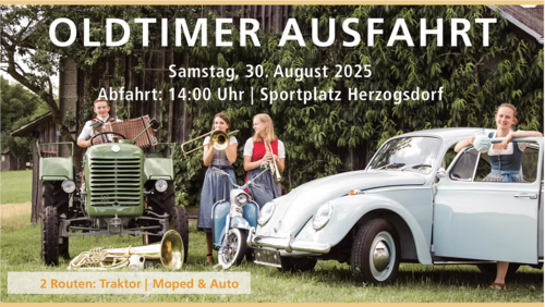 Der örtliche Musikverein veranstaltet am Samstag, 30.8.25 eine Oldtimerausfahrt. Abfahrt um 14 Uhr in der Sportplatzstraße 1, 4175 Herzogsdorf im oberen Mühlviertel.