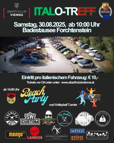 „ITALO-TREFF“ für Fahrzeuge aus unserem südlichen Nachbarland am Samstag, 30.8.25 ab 10 Uhr am Badestausee 2835/2, 7212 Forchtenstein bei Mattersburg an der Grenze zu NÖ. Eintritt pro Fahrzeug 10 €.