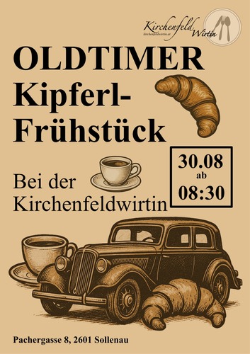 Oldtimerkipferlfrühstück bei der Kirchenfeldwirtin in 2601 Sollenau, Pachergasse 8, am Samstag, 30.8.25 ab 8.30 Uhr.