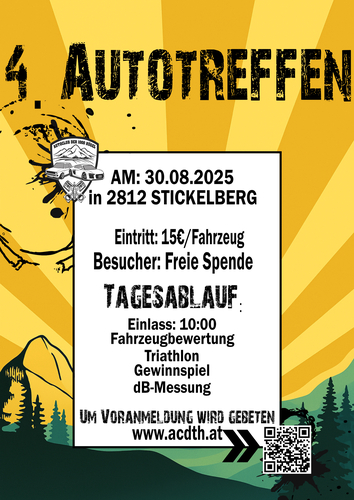 Autotreffen mit Gewinnspiel & Fahrzeugbewertung am Samstag, 30.8.25 ab 10 Uhr in 2812 Stickelberg (nahe Grimmenstein in der Buckligen Welt). Eintritt 15 € pro Fahrzeug. Anmeldung erbeten!