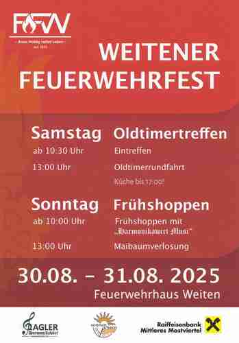 Das Feuerwehrfest in 3653 Weiten (nördlich Melk), Hauptstraße 63 bildet den Rahmen für ein Oldtimertreffen mit Rundfahrt am Samstag, 30.8.25 ab 10.30 Uhr.