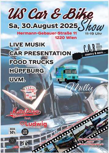 Die Oldtimerschmiede „Mattz Garage“ bittet am Samstag, 30.8.25 ab 11 Uhr zu einer familiengerechten US-Car & Bikeshow am Parkplatz von Möbel Ludwig, 1220 Wien, Hermann-Gebauer-Straße 11. Hollywood-Cars, Food-Truck, Livemusik und eine Hüpfburg für die Kleinen sorgen für die richtige Stimmung.