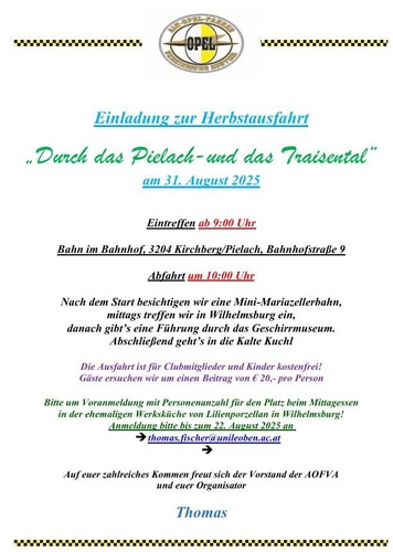 Nicht nur für Opelfahrer ist die „Herbstausfahrt“ des AOFVA am Sonntag. 31.8.25 ab 9 Uhr ein besonderes Ereignis. Treffpunkt ist in 3204 Kirchberg/Pielach, Bahnhofstraße 9. Nach der Besichtigung einer Modelleisenbahn geht’s zum Geschirrmuseum nach Wilhelmsburg und weiter in die „Kalte Kuchl“. Nenngeld 20 € pro Person. Anmeldung erforderlich.