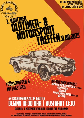 Familienfreundliches Oldtimertreffen mit Frühschoppen, Wettbewerben, Ausfahrt, Siegerehrung, DJ und Hüpfburg in 3851 Kautzen, Hauptplatz 1, an der tschechischen Grenze bei Waidhofen an der Thaya am Sonntag, 31.8.25 ab 10 Uhr.