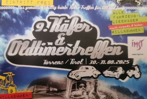 Käfer- & Oldtimertreffen mit Rundfahrt in 6464 Tarrenz (nördlich Imst), Hauptstraße 32, beim Gasthaus Sonne, am Samstag, 30.8.25 ab 10 Uhr und Sonntag, 31.8.25 bereits ab 7 Uhr. BBQ, Livemusik & Fahrzeugprämierungen bilden das Rahmenprogramm.