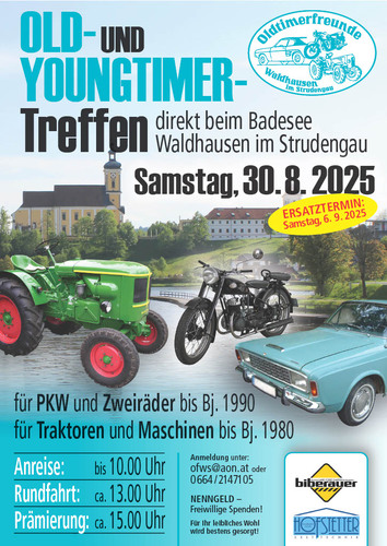 Old- &Youngtimertreffen mit Rundfahrt & Prämierung beim Badesee an der Hasenbergstraße, 4391 Waldhausen im Strudengau (an der Grenze zu NÖ nördlich Grein) am Samstag, 30.8.25 ab 9 Uhr. Anmeldung erbeten.