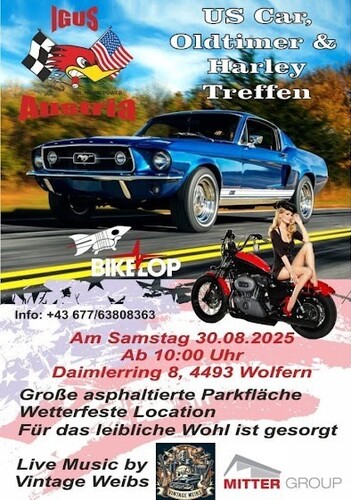 Auch in diesem Jahr gibt es wieder das US-Car, Oldtimer- und Harleytreffen in 4493 Wolfern (nördlich Steyr), Daimlerring 8. Samstag, 30.8.25 ab 10 Uhr. Livemusik und Gastronomie sorgen für ein stimmungsvolles Event.