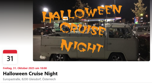 „Halloween Cruise Night“ am Freitag, 31.10.25 ab 18 Uhr am Parkplatz von Mc Donalds in der Europastraße 2, 8200 Gleisdorf.