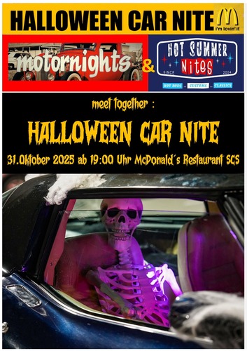 Gruselig wirds am Freitag, 31.10.25 ab 19 Uhr am Parkplatz vorm Mc Donalds in der SCS am Vösendorfer Westring, 2334 Vösendorf: die Organisatoren der „Motornights“ und der „Hot Summer Nites“ bitten gemeinsam zur „Halloween Car Nite“! Verkleidungen und Car-Deko sind natürlich gern gesehen, aber keine Pflicht!