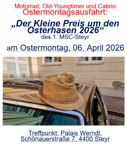 Gemütliche Ausfahrt am Montag, 6.4.26, ab 8.30 Uhr, in 4400 Steyr. Treffpunkt ist das Palais Werndl, Schönauerstraße 7. Die Ausfahrt dauert etwa zwei Stunden und geht über ca 60 km. Wer sein Osterei heil ins Ziel bringt, darf mit einem Preis rechnen! Nenngeld für Fahrzeug & Fahrer 20 €, Beifahrer 5 €. Um Voranmeldung bei msc.steyr@gmail.com oder 0676-5533107 wird gebeten.