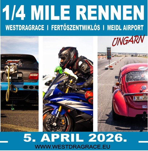 Beschleunigung, Adrenalin und packende Duelle auf der Startbahn beim Dragsterrennen für Autos und Motorräder am Sonntag, 5.4.26 ab 8 Uhr am Meidl-Flugplatz in 9444 Fertőszentmiklós, Jókai u. 2 (südlich des Neusiedlersees bei Sopron).