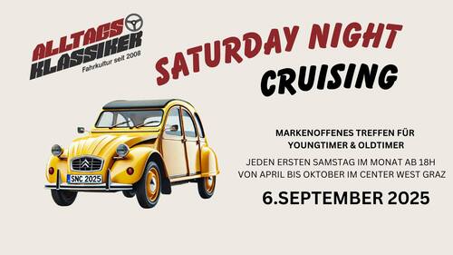 Am ersten Samstag im Monat ist es in der steirischen Landeshauptstadt wieder Zeit für das „Alltagsklassiker Saturday Night Cruising“, ein Old- und Youngtimertreffen, diesmal am 6.9.25 ab 18 Uhr, am Parkplatz des Einkaufszentrums Center West, Weblinger Gürtel 25, 8054 Graz.