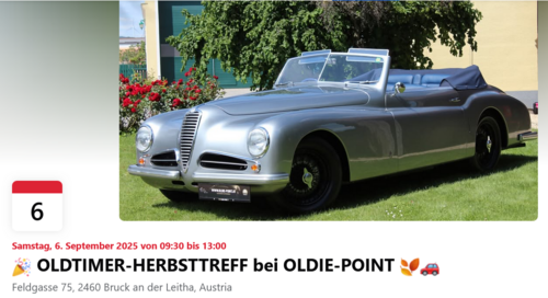 „Oldtimer Herbsttreff“ bei Oldie-Point in 2460 Bruck an der Leitha, Feldgasse 75, am Samstag, 6.9.25 von 9.30 bis 13 Uhr. Zu besichtigen sind drei Hallen voller Oldtimer und ein liebevoll gestaltetes Landwirtschaftsmuseum. Natürlich gibt’s auch Drinks & Benzingespräche an der Oldie-Bar!