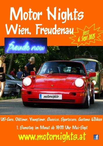 Saisonschluss für die populären „Motornights“ im Prater hinter dem Lusthaus, 1020 Wien, Rennbahnstraße 65A, am Samstag, 6.9.25 offiziell ab 18 Uhr. Viele kommen schon früher, um sich ihren Lieblingsstandplatz zu sichern.