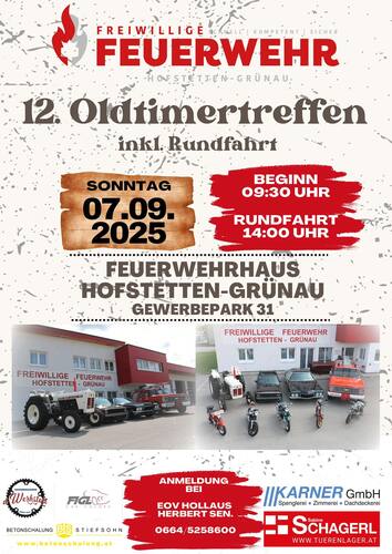 Am Samstag, 6.9.25 gibt es im Rahmen des Feuerwehrfests ab 14 Uhr ein familiengerechtes Oldtimertreffen mit Ausfahrt in 3454 Gutenbrunn 15 bei Herzogenburg.