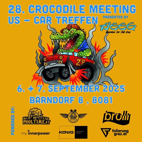 Das „Crocodile Meeting“ ist ein US-Car Treffen mit Fahrzeugbewertung, Lowridershow, Livemusik und Tombola am Samstag, 6.9. und Sonntag, 7.9.25 jeweils ab 10 Uhr beim Lippizaner Franzl in Bärndorf 8, 8081 Heiligenkreuz am Waasen (südlich Graz).