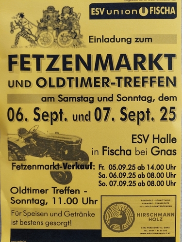 Oldtimertreffen bei der Stocksporthalle, Fischa 35, 8342 Gnas (südlich Feldbach) am Sonntag, 7.9.25 ab 11 Uhr.