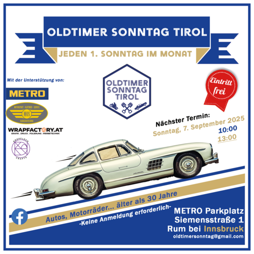 Der „Oldtimersonntag“ ist eine regelmäßige Veranstaltung, immer am ersten Sonntag im Monat am Metro Parkplatz in 6063 Rum bei Innsbruck, Siemensstraße 1. Ein Treffen nicht nur für Oldtimer-Besitzer, sondern für alle, die sich für automobile Klassiker begeistern können, diesmal am 7.9.25 ab 10 Uhr.