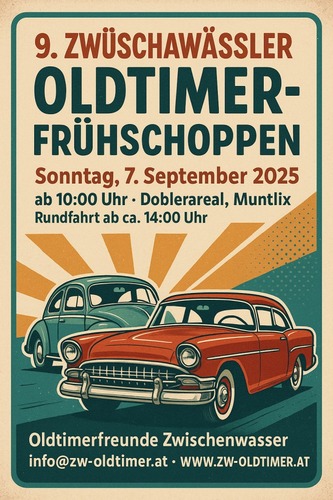 „Zwüschawessler Oldtimerfrühschoppen“ mit Rundfahrt am Sonntag, 7.9.25 ab 10 Uhr in 6835 Muntlix, Doblerareal, Kreuzstraße 9.