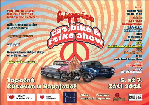 Die „Hippie Car & Bike Show“ von Freitag, 5.9. ab 16 Uhr bis Sonntag, 7.9.25 bei der Disco City Bůrovce, 68711 Topolná 500 (östlich von Brünn) lässt mit Music, Love & Peace echtes 60er Jahre Feeling aufkommen. Eintritt ab 200 CZK (ca 8 €).