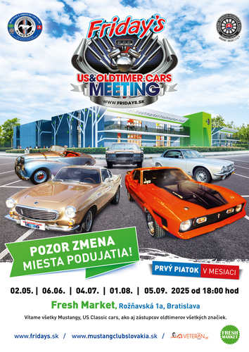 Saisonausklang für die „Fridays“, einem markenoffenen Treffen des Mustang Clubs beim Fresh Market, Rožňavská 1a, 83104 Bratislava, immer am ersten Freitag des Monats ab 18 Uhr. Freitag, 5.9.25 nur 5 km nach der österreichischen Grenze!