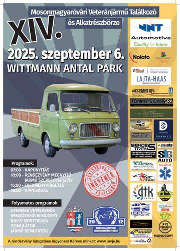 Familiengerechtes Oldtimertreffen mit Markt im Antal-Wittmann-Park in 9200 Mosonmagyaróvár (gleich nach der österreichischen Grenze bei Nickelsdorf) am Samstag, 6.9.25 ab 7 Uhr. Prämierung & Tombola sind die Highlights. Anmeldung erbeten!