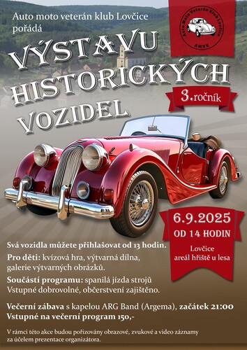 Familiengerechtes Oldtimertreffen mit Ausfahrt und Livemusik am Samstag, 6.9.25 ab 13 Uhr am Sportplatz in 69639 Lovčice (südöstlich von Brünn).