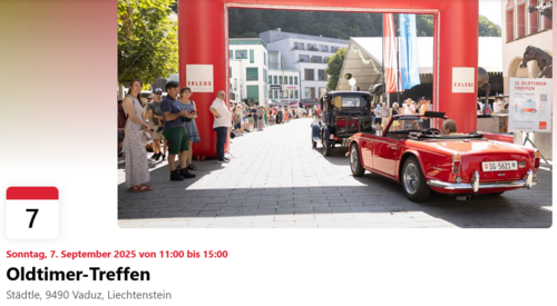 Oldtimertreffen mit Publikumswertung am Sonntag, 7.9.25 ab 11 Uhr in 9490 Vaduz entlang der Strasse „Städtle“ vom Rathaus bis zur Postgass. Anmeldung erforderlich!