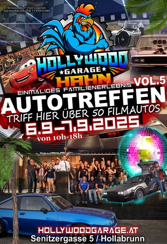 Hollywood in Hollabrunn! Beim Autotreffen in der Garage Hahn, Senitzergasse 5, 2020 Hollabrunn kann man viele Fahrzeuge aus TV und Film aus der Nähe bestaunen. Sämtliche Besucher mit Oldtimer- oder Tuningfahrzeugen, aber auch Traktoren, sind herzlich willkommen! Natürlich gibt’s auch ein Kinderprogramm, Musik und Gastronomie! Samstag, 6.9. und Sonntag, 7.9.25 jeweils ab 10 Uhr. Eintritt ab 19 €.