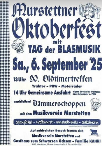 Oldtimertreffen mit Ausfahrt am Samstag, 6.9.25 ab 13 Uhr im Rahmen des Oktoberfestes im Black Ox, 3142 Murstetten (östlich St. Pölten), Untere Hauptstraße 6.