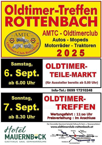 Etwas für Frühaufsteher ist der Teilemarkt in 4681 Rottenbach (bei Haag am Hausruck) am Samstag, 6.9.25 ab 6 Uhr früh. Am Sonntag, 7.9.25 folgt dann ein Oldtimertreffen mit Wertungsfahrt und Preisverleihung ab 8.30 Uhr.