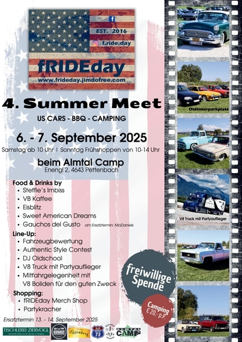 Das „fRIDEday Summer Meet“ ist ein US-Car Treffen am Campingplatz Almtal, Enengl 2, 4643 Pettenbach (bei Vorchdorf) am Samstag, 6.9.25 ab 10 Uhr mit Ausfahrt, Fahrzeugbewertung und Style Contest. Am Sonntag 7.9.25 geht’s ebenfalls ab 10 Uhr mit einem Frühschoppen weiter.