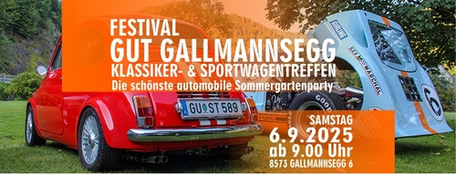 Automobile Sommergartenparty für Oldtimer & Sportwagen am Samstag, 6.9.25 ab 9 Uhr am Gut Gallmannsegg 6, 8573 Kainach bei Voitsberg. „Concorso d'Eleganza", Livemusik und Marktplatz runden das Programm ab.