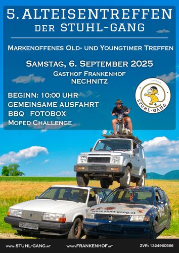 Am Samstag, 6.9.25, veranstaltet die „Stuhl-Gang“ ab 10 Uhr ein familiengerechtes „Alteisentreffen“ mit Ausfahrt beim Gasthof Frankenhof, 8163 Nechnitz 7 (zwischen Graz und Kapfenberg). Fotobox und Livemusik bilden das Rahmenprogramm.